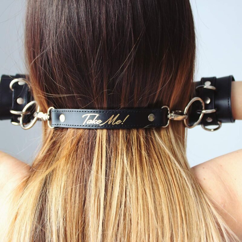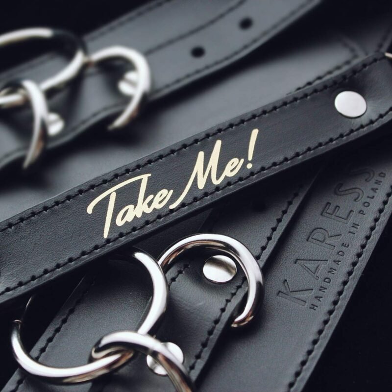 Produkt podszyty od wewnątrz miękkim materiałem dla maksymalnego komfortu w okolicach nadgarstków. W środkowej części paska łączącego dłonie umieszczono złoty napis „Take Me!” nadający wyjątkowego charakteru. Solidne zapięcia gwarantują bezpieczeństwo użytkowania.