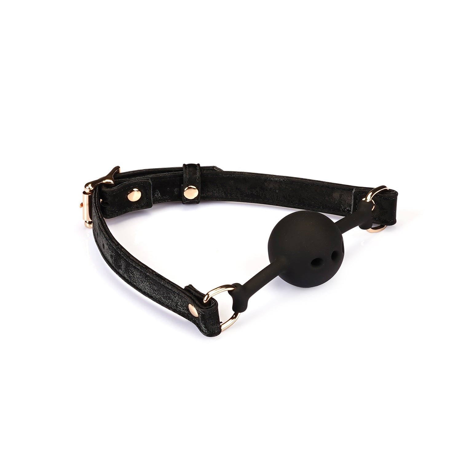 Regulowany pasek pozwala na precyzyjne dopasowanie, oferując zakres od 41 do 54 cm. Lśniące złote okucia dodają wyrafinowanego stylu, czyniąc knebel wyjątkowym dodatkiem do każdej kolekcji bondage.