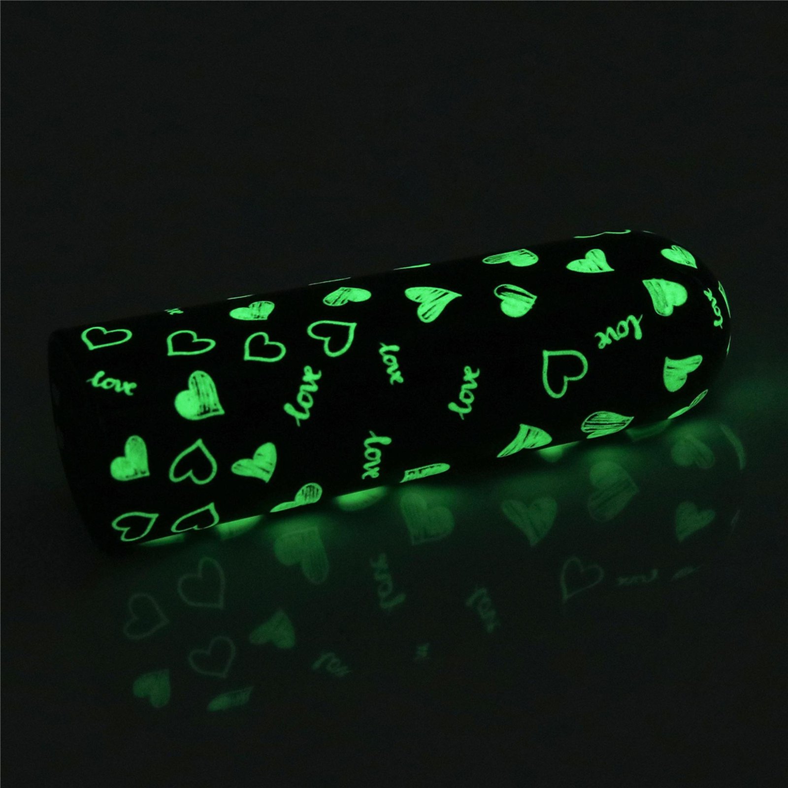 - Uroczy wzór serca z zieloną poświatą, który świeci w ciemności.